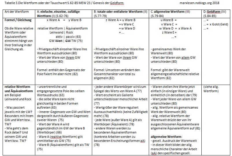 • Tauschwert (TW) = Erscheint als quantitatives Verhältnis worin sich verschiedene GW tauschen. Der TW von einem Stuhl drückt sich in 4 Gummistiefeln aus. Die Gummistiefel sind der TW des Stuhls. Der TW ist die Ausdrucksweise/ “Erscheinungsform” eines von ihm Verschiedenen, einem gemeinsamen Dritten (dem Wert).  /  “Das Gemeinsame, was sich im Austauschverhältnis oder Tauschwert der Ware darstellt, ist also ihr Wert. Der Fortgang der Untersuchung wird uns zurückführen zum Tauschwert als der notwendigen Ausdrucksweise oder Erscheinungsform des Werts, welcher zunächst jedoch unabhängig von dieser Form zu betrachten ist.” (MEW 23: 53)