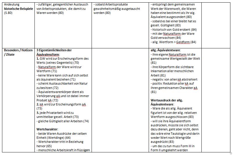 • abstrakt menschliche Arbeit = Das Gemeinsame aller konkreten Arbeiten, die gleichzeitige Verausgabung von Hirn, Muskel, Nerv, etc.. In jedem menschlichen Arbeitsvorgang werden Nährstoffe, also Energie verbrannt. / “Mit dem nützlichen Charakter der Arbeitsprodukte verschwindet der nützlicher Charakter der in ihnen dargestellten Arbeiten, es verschwinden also auch die verschiedenen konkreten Formen dieser Arbeiten, sie unterscheiden sich nicht länger, sondern sind allzusamt reduziert auf gleiche menschliche Arbeit, abstrakt menschliche Arbeit.” (MEW 23: 52)