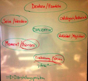 - Sein / Werden: Das vorherrschende Denken, der Positivismus, will die Dinge voneiannder isolieren und erkennt nicht ihren inneren Zusammenhang, wenn überhaupt dann noch ihre äußere Summierung (die Gesellschaft ist dann z. B. Summe ihrer einzelnen Subsysteme Politik, Wirtschaft, Recht, etc.). Für Hegel hingegen sind alle einzelnen Momente und Dinge immer Teil einer Totalität, des Ganzen. Will man ein “bestimmtes Sein”, ein Ding definieren, muss man es von allem anderen abgrenzen. Darin wird die Beziehung deutlich, die die einzelnen Momente, Dinge zum Ganzen haben. Die Momente, die Dinge entwickeln sich, sie kommen und vergehen. Ein Samen wächst zu einer Pflanze, die eine Knospe ausbildet, die eine Blüte wird und verwelkt und dann wieder einen Samen hervorbringt. Das Sein wird als Werden begriffen, es entsteht und vergeht.