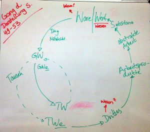 Wieso können die das? Das ist nur möglich, weil sie ein gemeinsames Drittes haben – also auch hier wieder: etwas das hinter den unmittelbar sichtbaren Erscheinungen liegt. Marx leitet weiter her: Das gemeinsame Dritte liegt darin, dass sie Produkte menschlicher Arbeitsprodukte sind und er macht’s genauer: Sie sind Produkte abstrakter Arbeit. Es ist diese Form der Arbeit, die die Substanz des Werts bildet. Der Endpunkt ist erreicht: der Wert. Der Kreis schließt sich hier: Denn der Reichtum der kapitalistischen Gesellschaft ist wesentlich abstrakter Recihtum, Wert. Dies ist das Wesen, dessen Erscheinungsform die Ware ist.