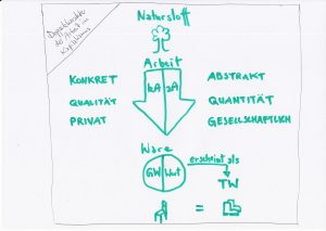 Dabei wurde nochmal die “Zwischlächtigkeit” oder Schizophrenie deutlich, die sich durch die Kategorien zieht: Konkrete versus abstrakte Arbeit, die sich dann in Stoffhaufen versus Werthaufen spiegelt; Gebrauchswert versus Tauschwert.
