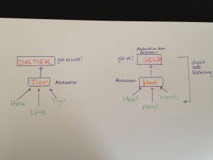 Jetzt ist es noch wichtig festzuhalten, woraus genau diese Trennung und die nachträgliche Pseudo-Wiedervergesellschaftung der Produzentinnen resultiert? Die Antwort: “Aus dem Geld” muss runtergebrochen auf “aus dem Wert”; aber auch das muss runtergebrochen werden auf die Antwort “aus der Arbeit”. Das aber muss präzisiert werden zu “Aus der abstrakten Arbeit”. Denn es ist die abstrakte Arbeit – nicht die konkrete! – die sich im Geld vergegenständlicht. Dies läuft über eine “Realabstraktion” ab. Was heißt das? Hilfreich ist die Analogie von Marx zur Abstraktion “Tier”. Die steht in der ersten Auflage des Kapital, aber nicht mehr in unserer vierten: