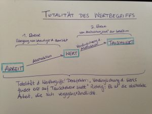 Außerdem ist es wichtig sich klarzumachen (das hat zuerst Hans-Georg Backhaus problematisiert und später Robert Kurz): Es mag aus dem Kapitel der Wertformanalyse nicht mehr so gut erkennbar sein (Marx hat das immer wieder krass überarbeitet und einige sagen: verhunzt), aber es geht hier um eine Totalität des Wertbegriffs: Es geht nicht nur um die Frage “wie wird der Wert zum Tauschwert zum Geld”, sondern die Preisfrage ist: “Wie wird die ARBEIT zum Wert zum Tauschwert zum Geld”. Die Arbeit ist also NICHT etwas, was der ganzen Sache zeitlich oder logisch vorgelagert ist – nach dem Motto “na gut, erstmal arbeiten die Leute unschuldig vor sich hin und – ups – auf dem sogenannten Markt im sogenannten Tausch kommt der böse Wert hinzu und verwandelt die Arbeitsprodukte.” Nee, nee!