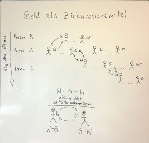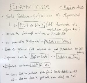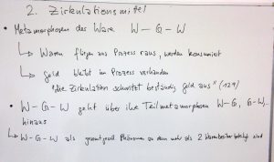 Dann sind wir ausgehend von der Frage wie Wert und Preis eigentlich miteinander zusammenhängen wild durchs Geldkapitel geritten, haben uns erschlossen was eigentlich die Preisform ist und was die Metamorphose der Ware bedeutet W-G-W (Kauf und Verkauf) und wie sie ineinanderfallen.